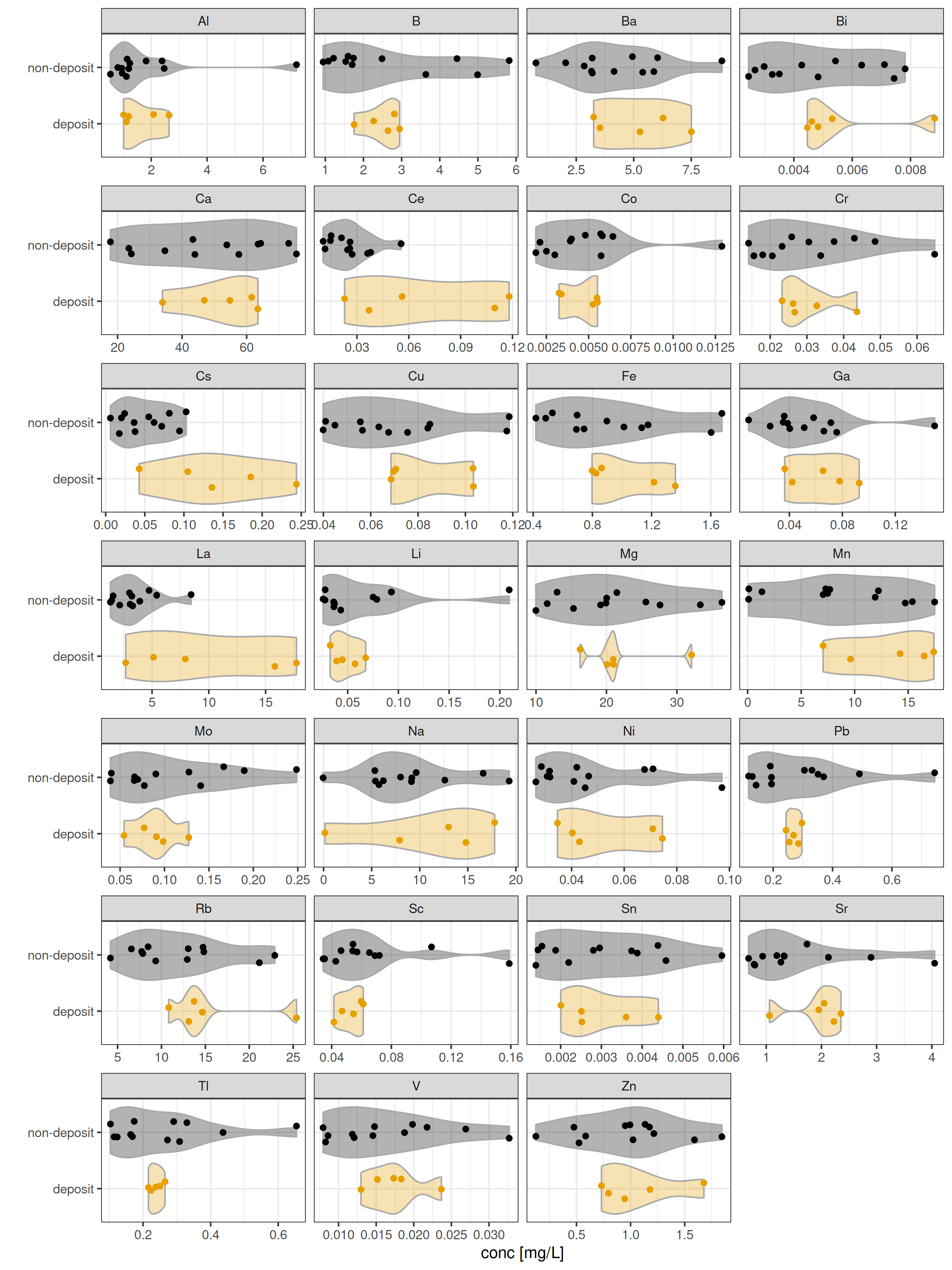 45. **Al, B, Ba, Bi, ... Zn** – Concentrations of elements (likely in **ppm/mg/g**) measured via lab analysis (e.g., ICP-MS).